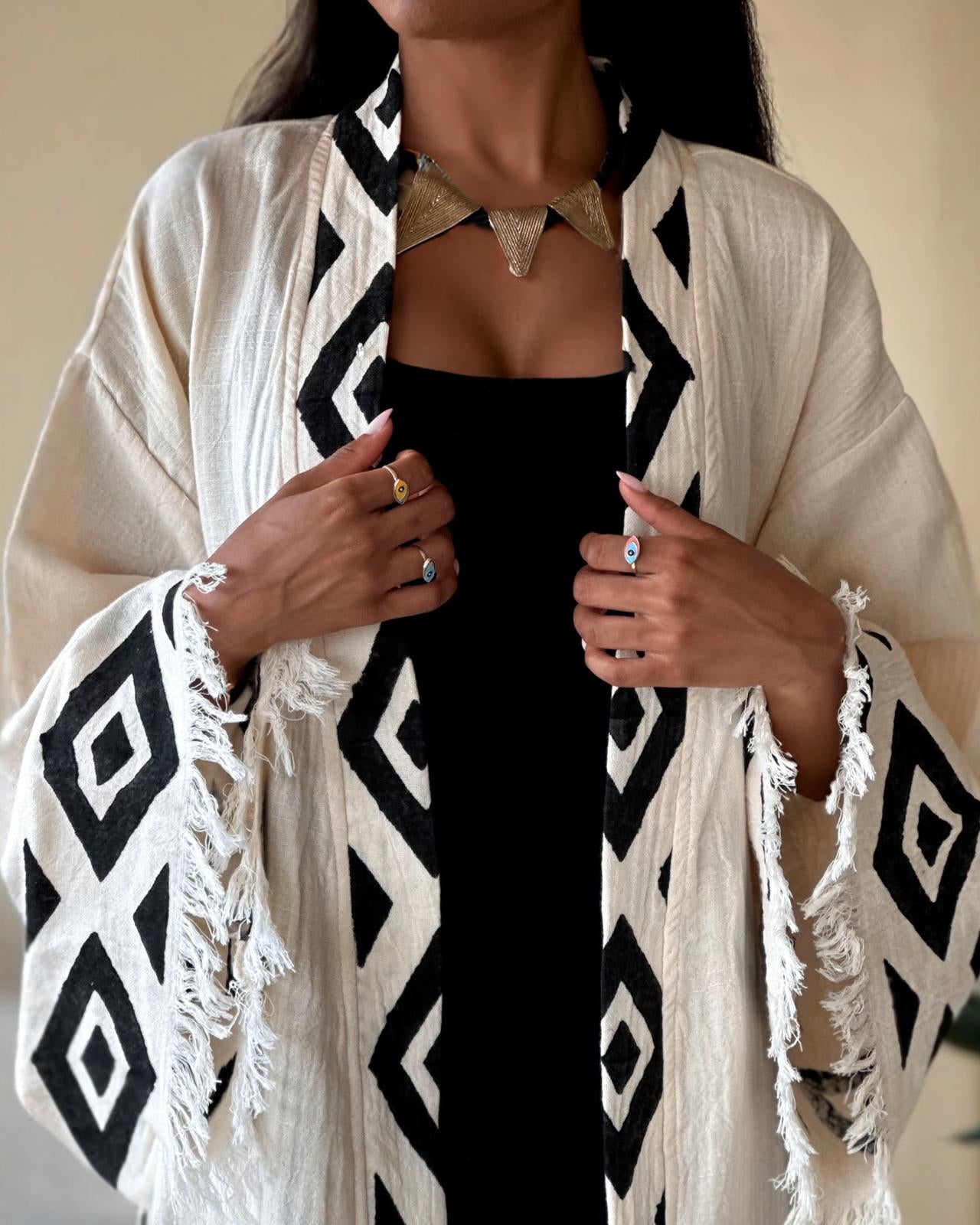Venusa . Artisan Kimono en coton léger imprimé à la bois – Tenue durable pour la plage et la détente