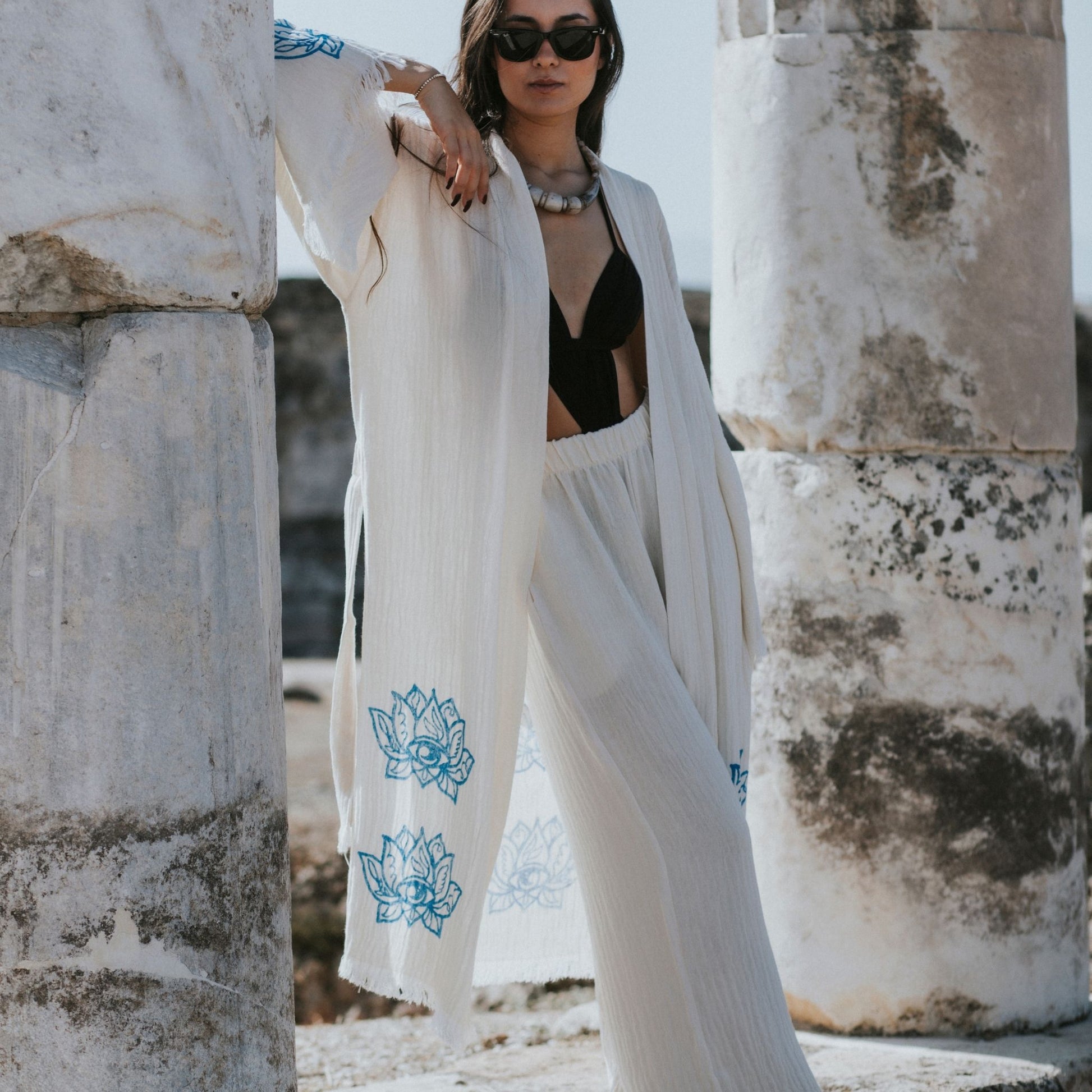 Ce kimono artisanal en tissu naturel est parfait pour les vacances, les journées à la plage ou les moments de détente. Sa matière légère et respirante offre un confort absolu, idéal pour une tenue élégante et décontractée toute l’année.