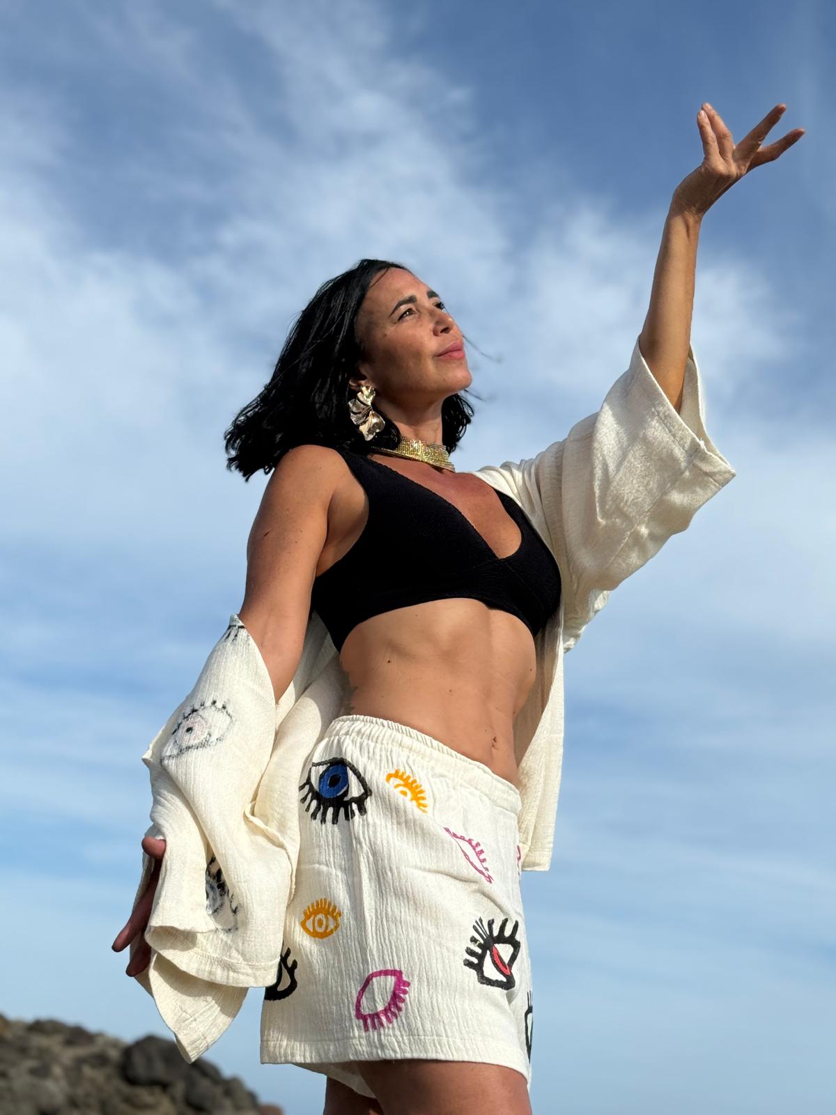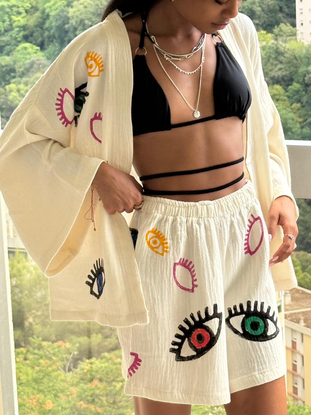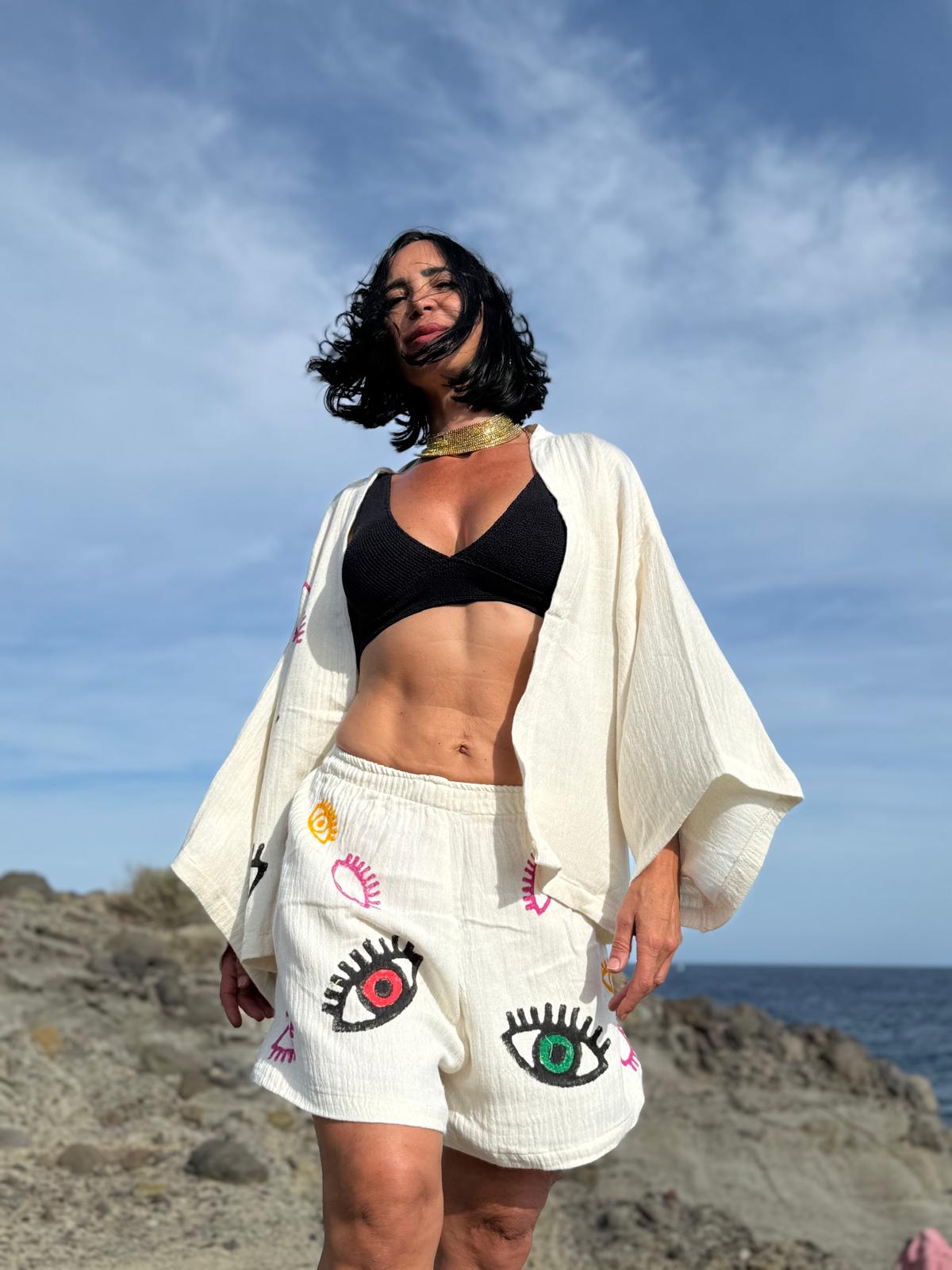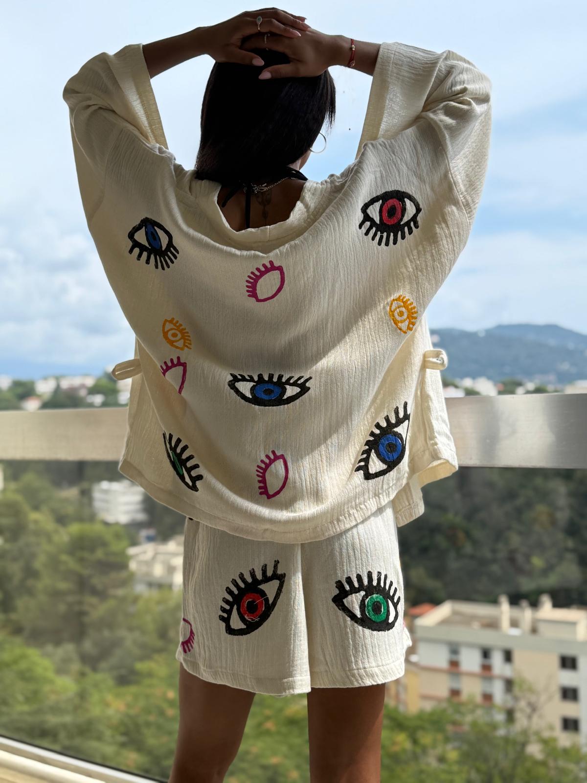 Ensemble deux pièces composé d’un kimono et d’un short, confectionné en 100 % coton naturel, léger et respirant. Chaque pièce est décorée de motifs Œil imprimés à la main avec des encres à base végétale. Parfait pour l’été : confortable, frais et authentique.