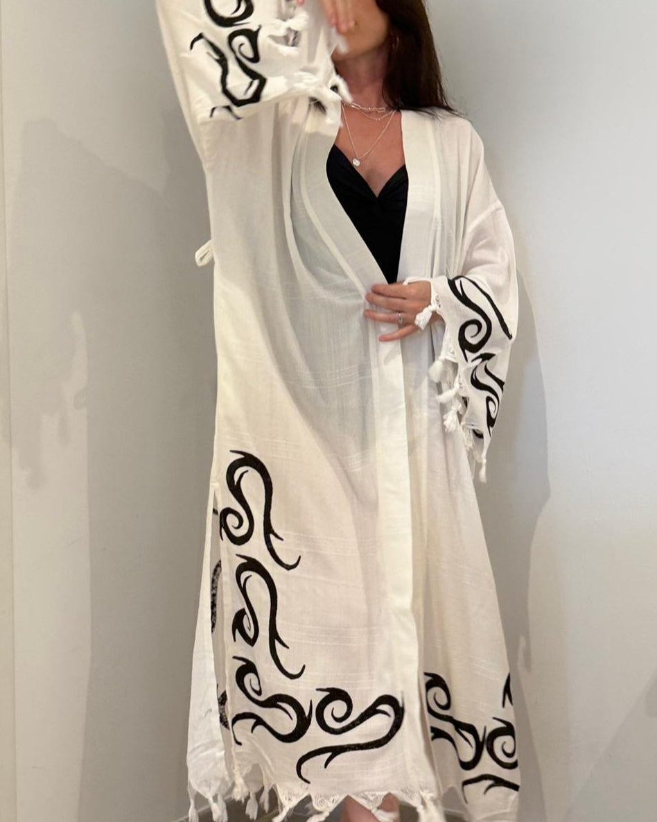 Venusa . Artisan Kimono en coton léger imprimé à la bois – Tenue durable pour la plage et la détente