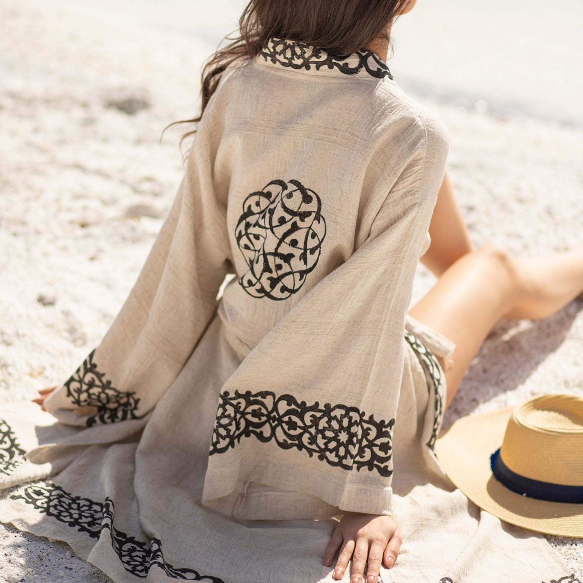 Ce kimono intemporel allie savoir-faire traditionnel et confort moderne, idéal pour une allure élégante et naturelle.
